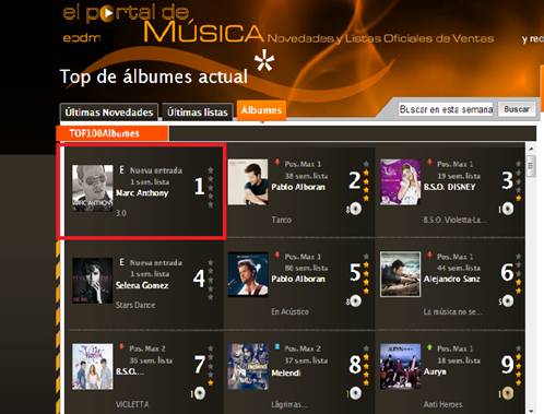 Marc Anthony ya es nº1 en la lista oficial de las discos más vendidas en España con su nuevo álbum 3.0 que se publicó el pasado 23 de julio. Vivir mi vida ha sido también nº1 en radios, en iTunes y en la lista Billboard durante cinco semanas en EEUU y gran parte de los países de América. El álbum 3.0 es el primer disco de música tropical en casi una década del emblemático artista latino y contiene diez canciones producidas por Marc Anthony y Sergio George y grabadas en los estudios Hit Factory de Miami y Top Stop Music en Delray Beach.