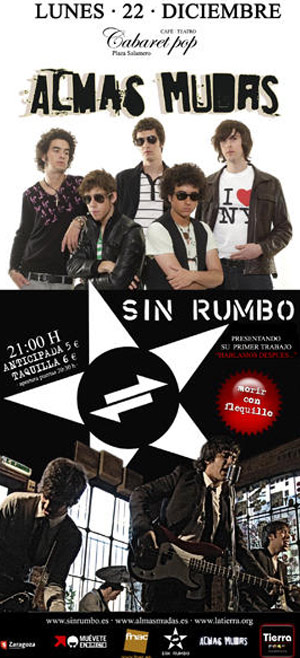 Jóvenes, con descaro y talento los Almas Mudas nos emplazan junto a sus compañeros de últimos conciertos y gira conjunta los Sin Rumbo a un nuevo concierto en la sala Cabaret Pop de Zaragoza el próximo 22 de diciembre a partir de las 20:45 de la noche. La novedad es que este evento está abierto a público de todas las edades, gente menor de edad podrá asistir, eso si, acompañado de uno de sus tutores legales.