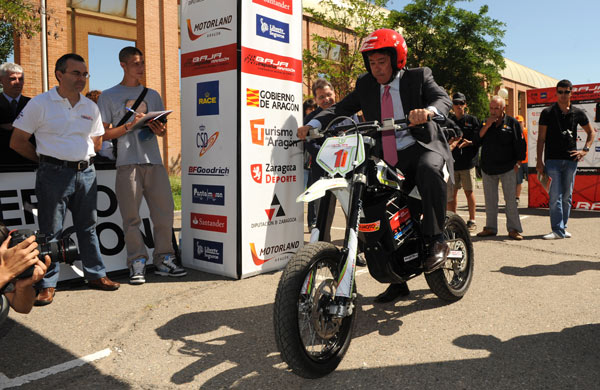 Para dar la bienvenida, un año más, a la carrera aragonesa, D. Arturo Aliaga, Consejero de Industria, Comercio y Turismo del Gobierno de Aragón, ha probado personalmente una de las motos que formarán parte de la EcoBaja, y ha sorprendido a los asistentes realizando un pequeño recorrido con este vehículo ecológico que apenas emite ningún ruido.